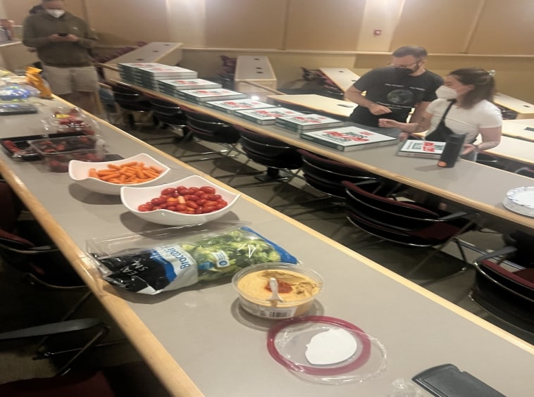 Because of the canceled trip, today was pretty chill. It was like having a gigantic sleepover with 42 people, and we even got to be in the large theater in the Dominici building. We had all sorts of snacks and fruits that were requested yesterday, although the loss of instant ramen and bubble tea was very apparent on the table.
