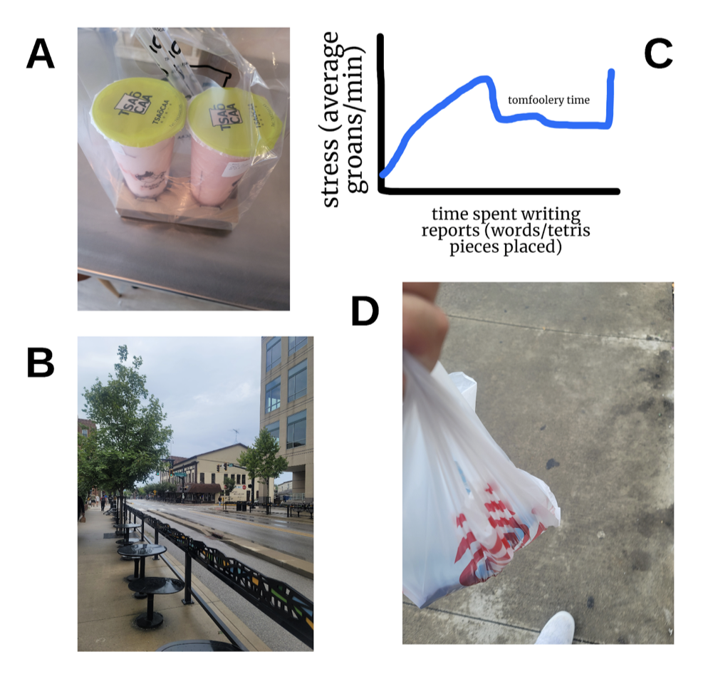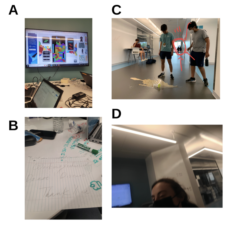 Although most of the day showed the expected pattern of attempts in decreasing levels of stress, there were times when that was not the case. For example, a participant was seen dropping their boba cup in their working space, causing an extreme amount of stress increase in a short period of time (Fig. 4). As shown, there was an intense conundrum and all the surrounding participants found it amusing, but the participants responsible were seen fleeing the scene. They soon returned to clean up their mess, and the floor is now spotless clean. Other examples of insanity are seen, ranging from random selfies to unfaithful signs written by the participants.