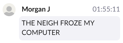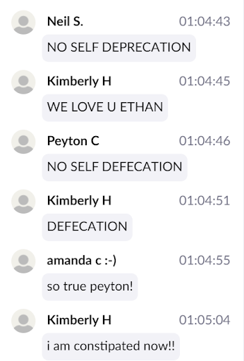 At long last, it was time for my own act. Firstly, Neil started it off with an impromptu disappearing trick in which he turned off his camera on Zoom (very cool, thank you Neil :D). Then, after some (totally staged) technical difficulties with screen sharing, the show finally got started. Pablo began with an eerie, horror-movie worthy act, and then Morgan and Caroline shocked the audience with their teleporting coin trick. Then, after a brief cameo from my evil twin (in which she killed me on live camera), the dancing queen herself, Sarah, led us in a charismatic performance of YMCA. However, all was not well, as in the middle of the performance, Caroline was kidnapped and dragged offscreen by Hillary! Unfortunately, at the time of writing this post, Carline’s ransom has still not been paid, so please make your payments to the following website in order to prevent her from death by pset: deeznuts.com