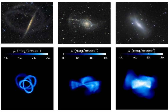 In the middle are shells or plumes, occurring when the orbits are extremely radial. The dwarf galaxy approaches close to the middle of the larger galaxy, resulting in a spread-out structure extending from the center.