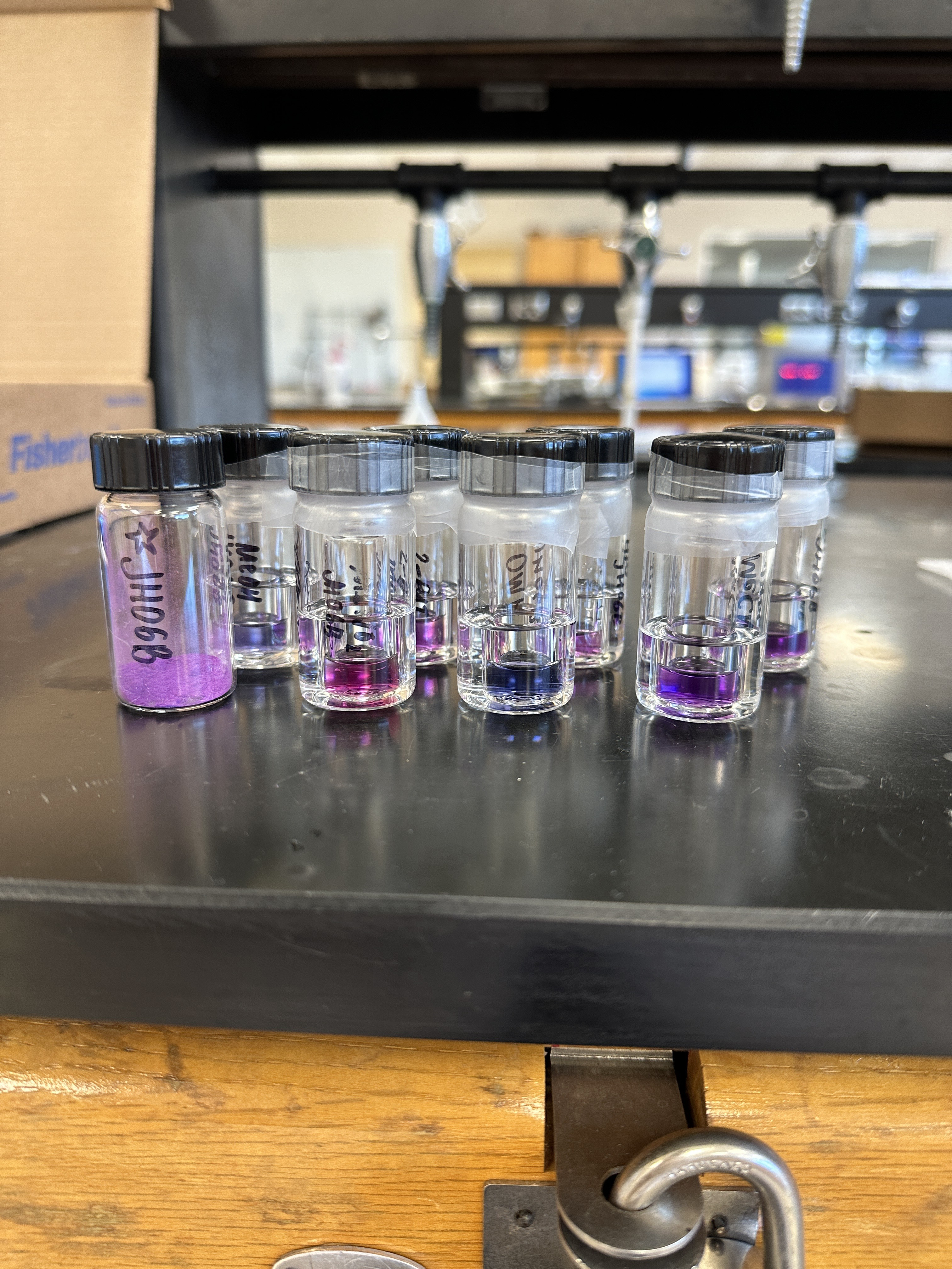 We dissolve these into vials containing different varieties of solvents, ranging from water to acetone and DMF (dimethylformamide), and other solvents as well! Here is a family picture of all my solutions: