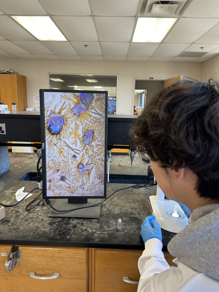 We put the smaller vials containing our dissolved powder into bigger vials containing ether, and then we seal them completely and hope that in a couple days they will grow pretty crystals! Here is my roommate looking at the crystals he got from his complex! Sometimes looking at other people’s crystals makes me a bit jealous…