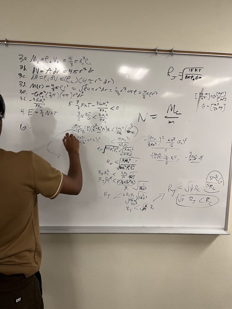 Today began the last full week of the program. Now equipped with all the knowledge necessary to complete our research project, we started our day with lectures on enrichment topics. We spent the first 3 hour lecture period working in groups to solve a set of problems guiding us towards estimating the characteristics of stars. The simplifications we learned made the math elegantly simple, yet complex enough to blacken my hand with erased white board marker.